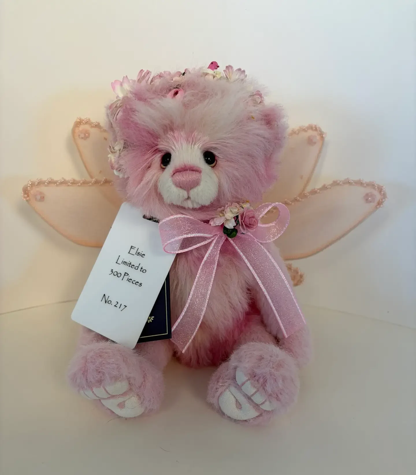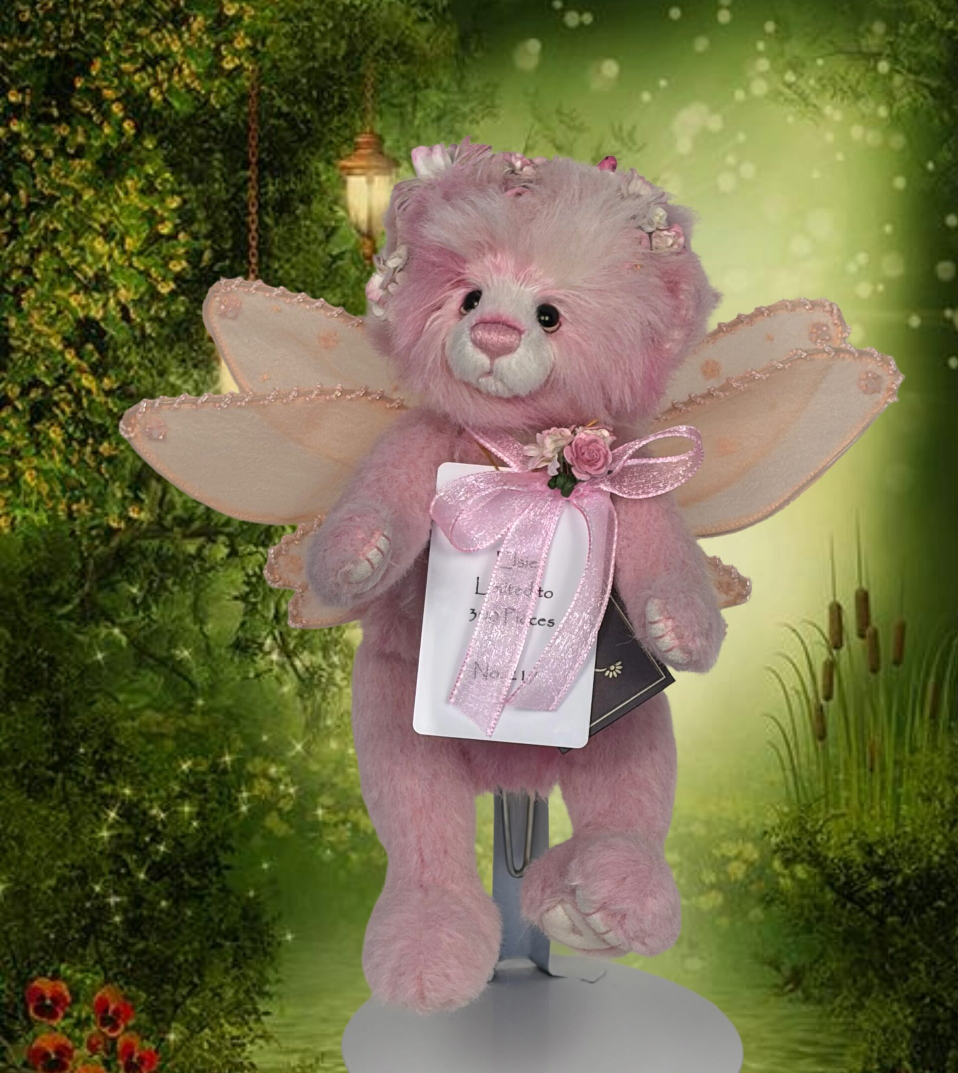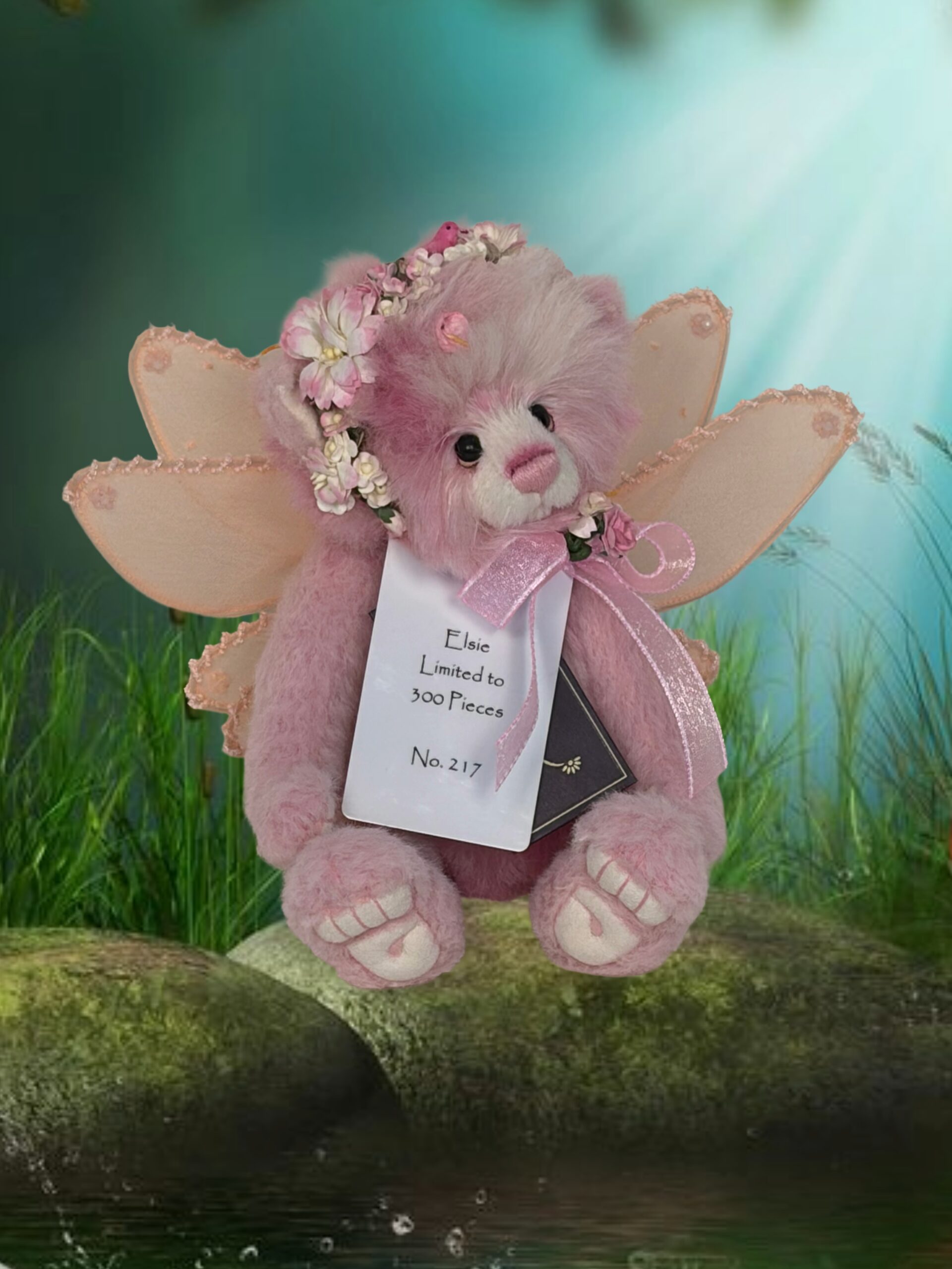 Fly into the magical realm of the Cottingley Fairies with this limited edition Elsie Fairy Bear by Charlie Bears! This sweet little pink fairy bear is made from mohair and alpaca, adorned with wings and a floral crown. Complete with a pretty pink bow, she’s the perfect addition to any collection. Only 300 made, so don’t miss out on Elise Fairy Bear!