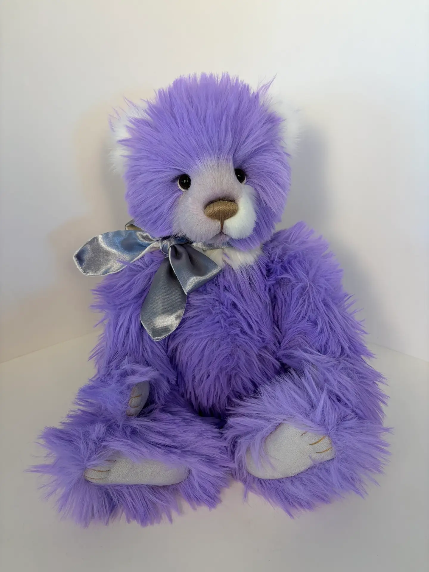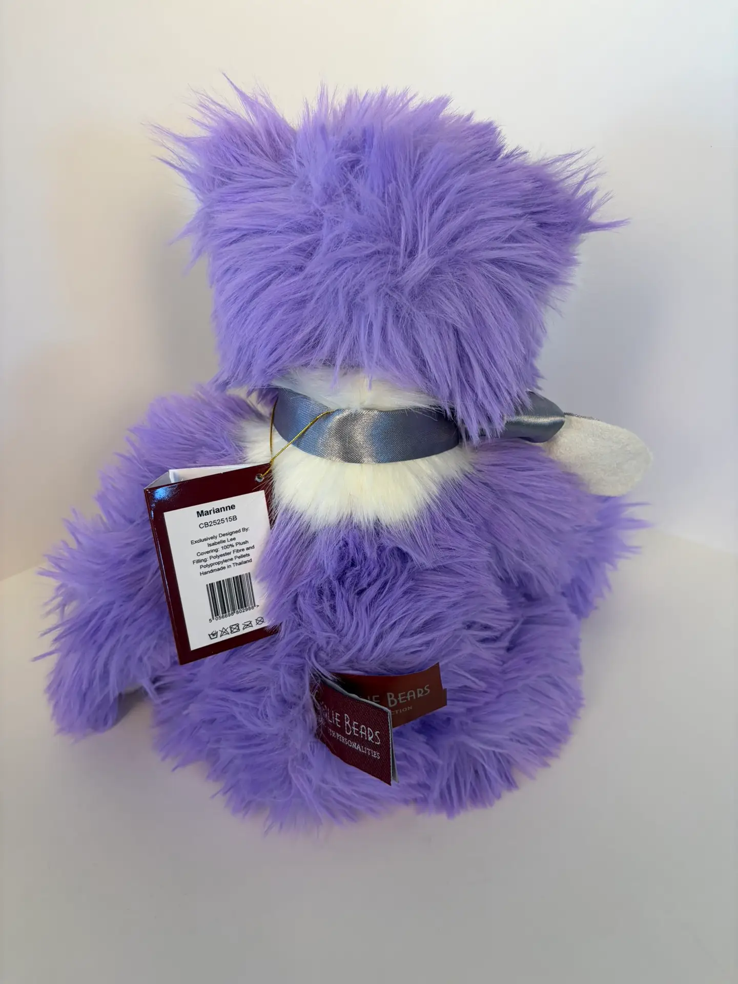 Marianne is a true standout in any hug. With luxuriously soft, vibrant plush purple fur and lovingly handcrafted details, she’s designed to be adored. Her expressive “Who, Me?” eyes are full of curiosity and mischief, giving her a personality that’s impossible to resist. Finished with a graceful grey satin bow tied neatly around her neck, Marianne is charm, comfort, and character wrapped into one unforgettable bear. Suitable for ages 3 years+. Bear height: 43cm/17″/14.3 Bear Paws.